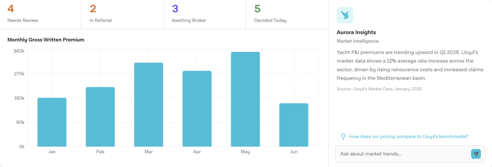 The copilot is not a chatbot. It's the AI layer embedded across Aurora's platform. It lives inside the workflows of brokers and underwriters, surfacing intelligence where decisions happen.