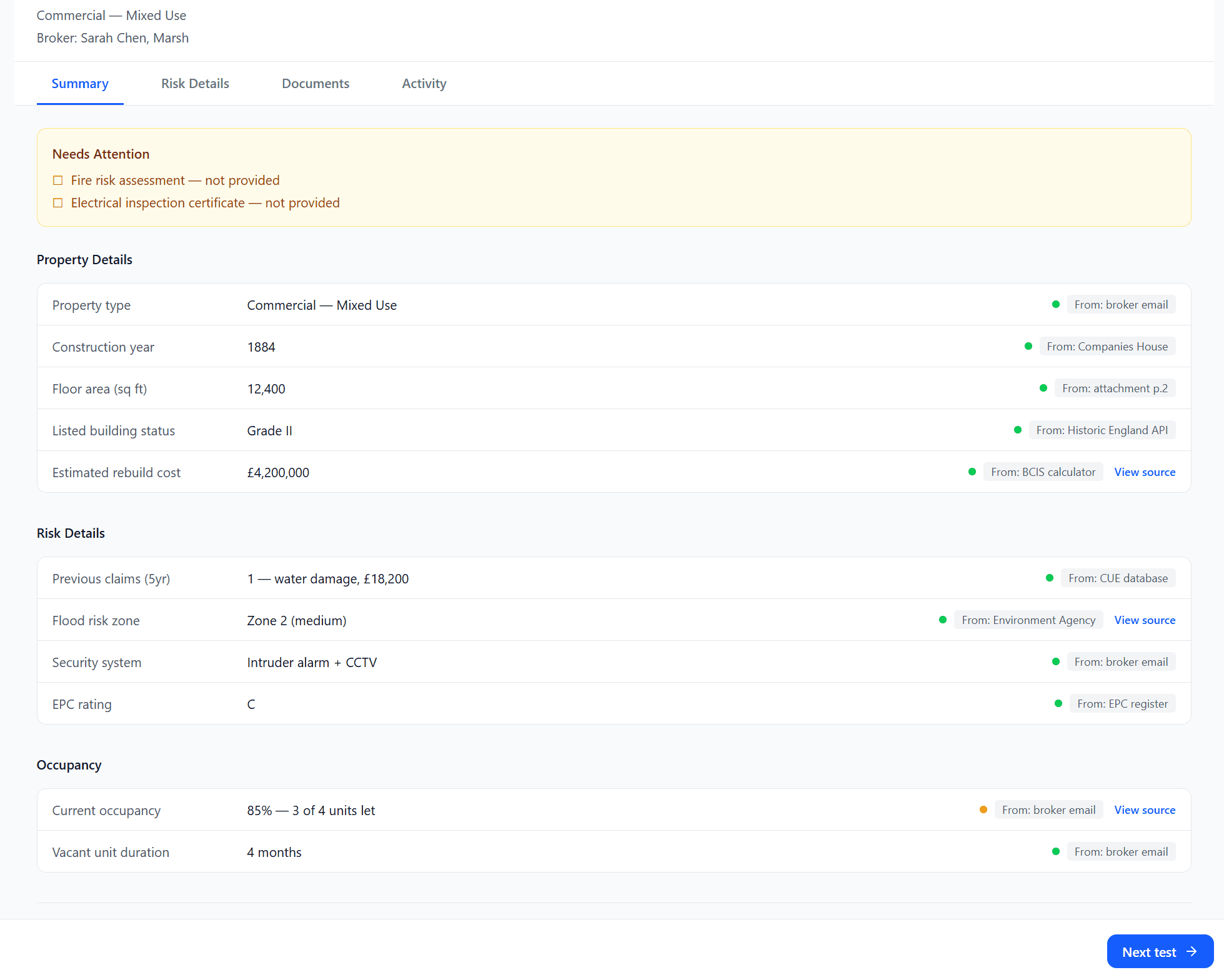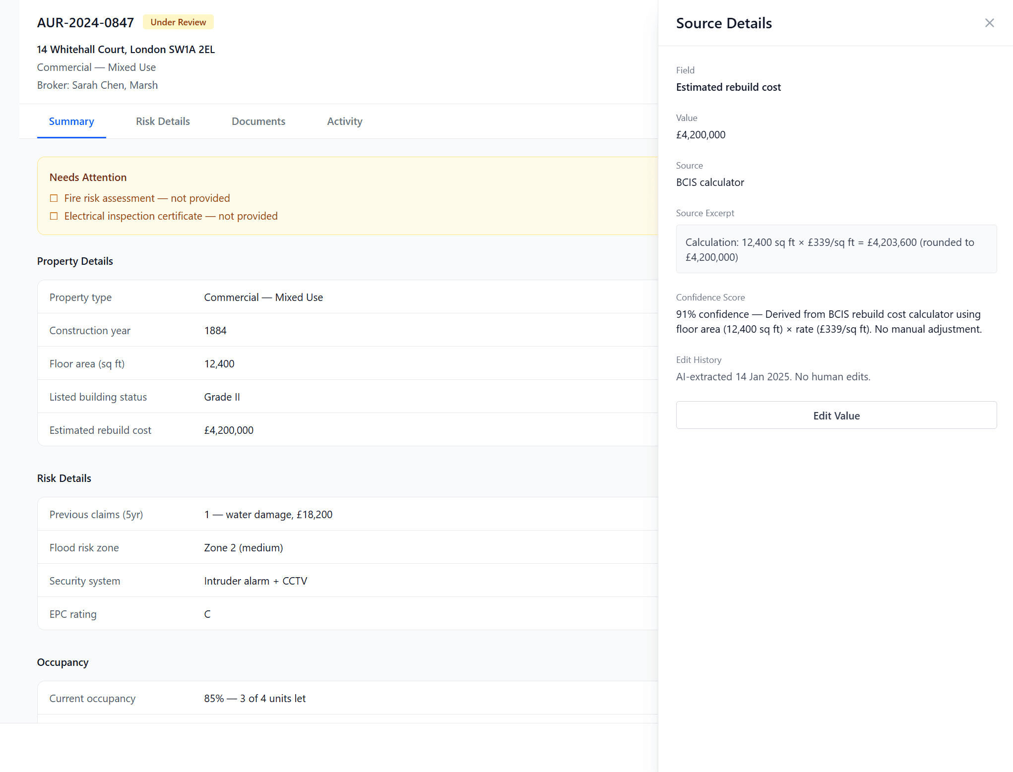 Under FCA regulation, we can surface information but cannot provide advisement. The AI can tell an underwriter that a rebuild cost is 40% below comparable properties. It cannot say to increase it. Every piece of AI-generated copy in the platform needed to respect this boundary