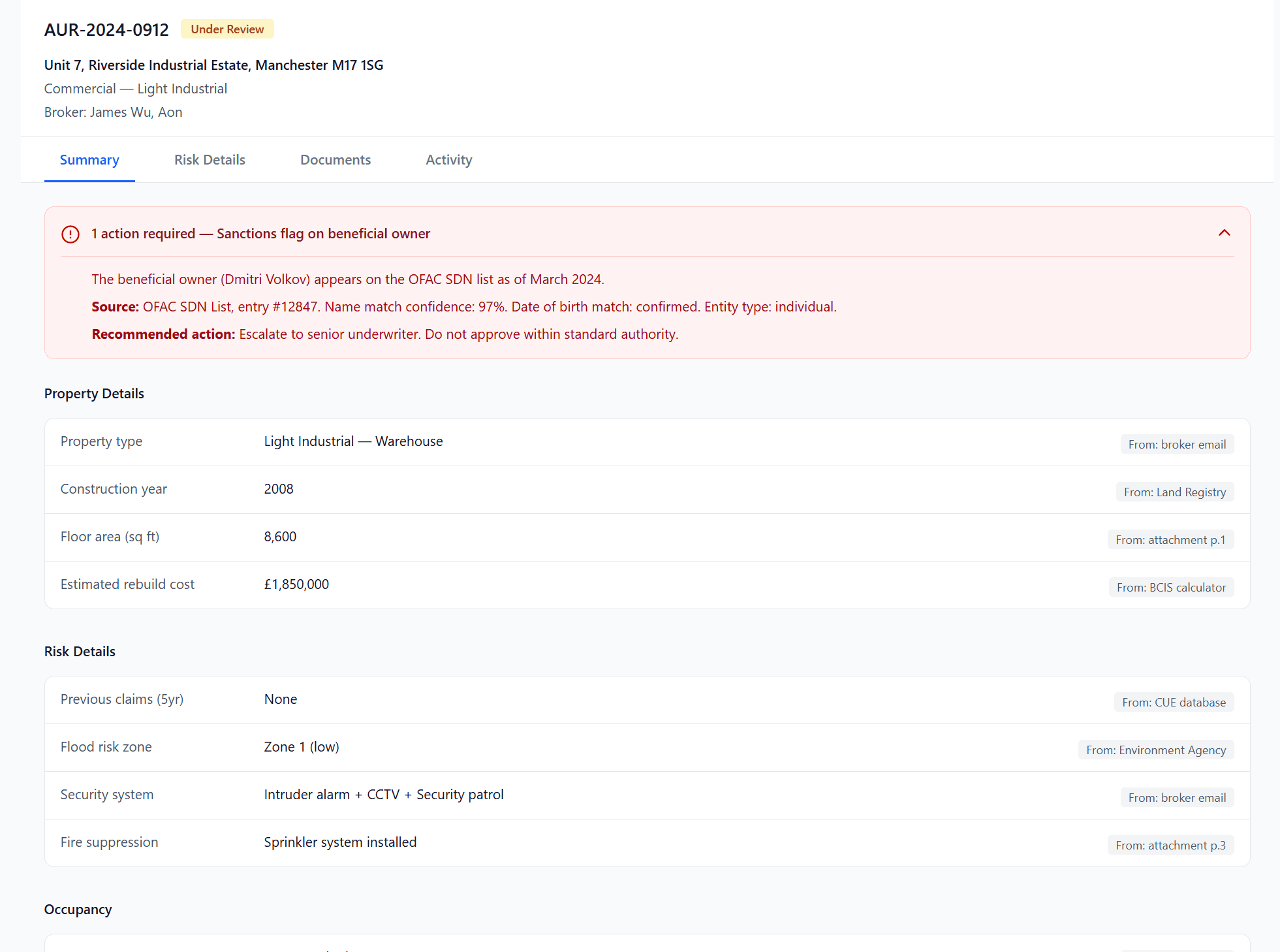 As an underwriter, I want risk signals surfaced in context, and not buried in a separate dashboard I have to navigate to.