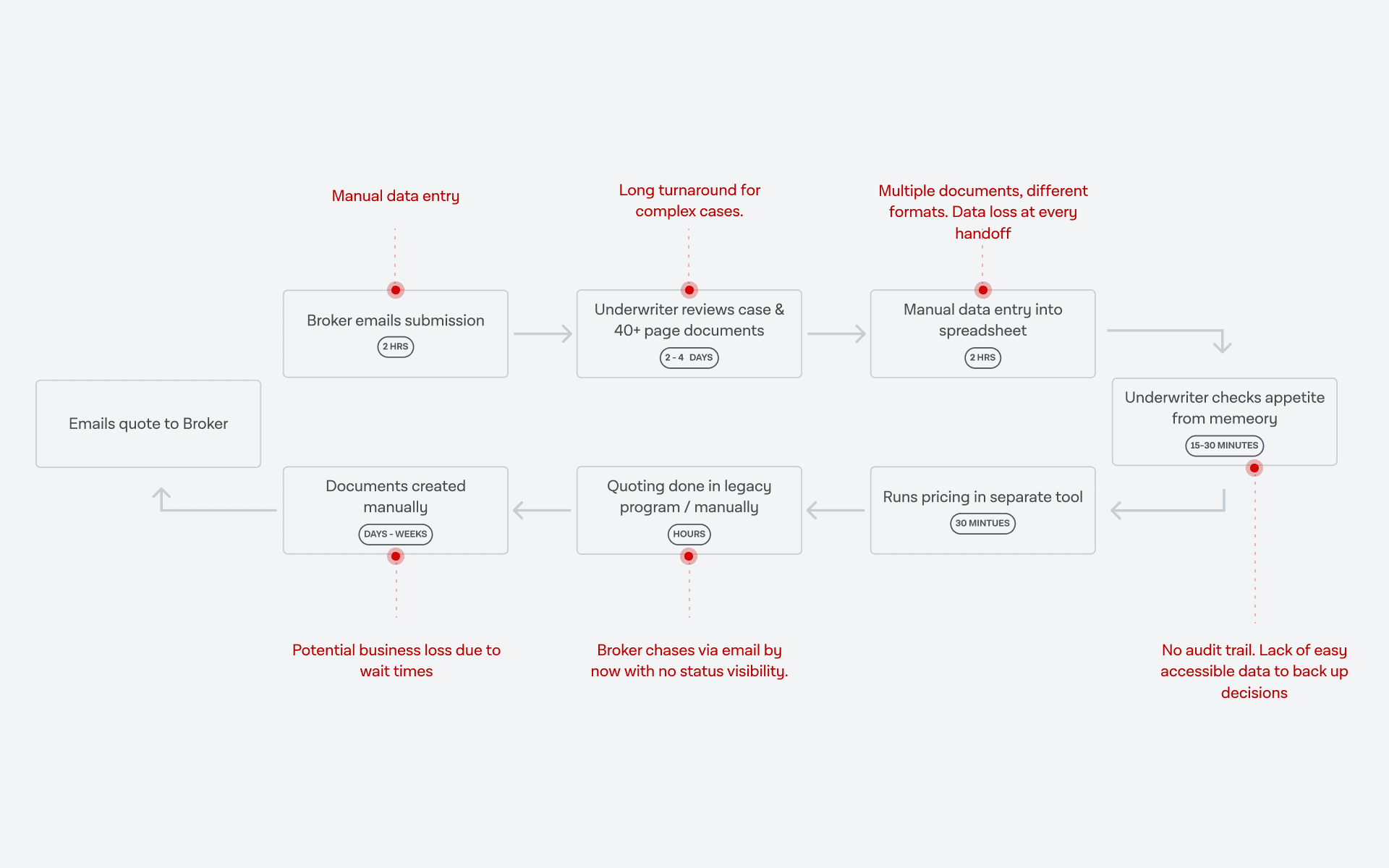 When we interviewed users, we found the workflow breaks at every handoff: brokers submit in inconsistent formats via email, underwriters re-key instead of deciding, insurers lack tools for rapid iteration, and quote-to-bind timelines stretch to weeks because information is scattered and incomplete. The practical result: lost momentum and wasted expertise.