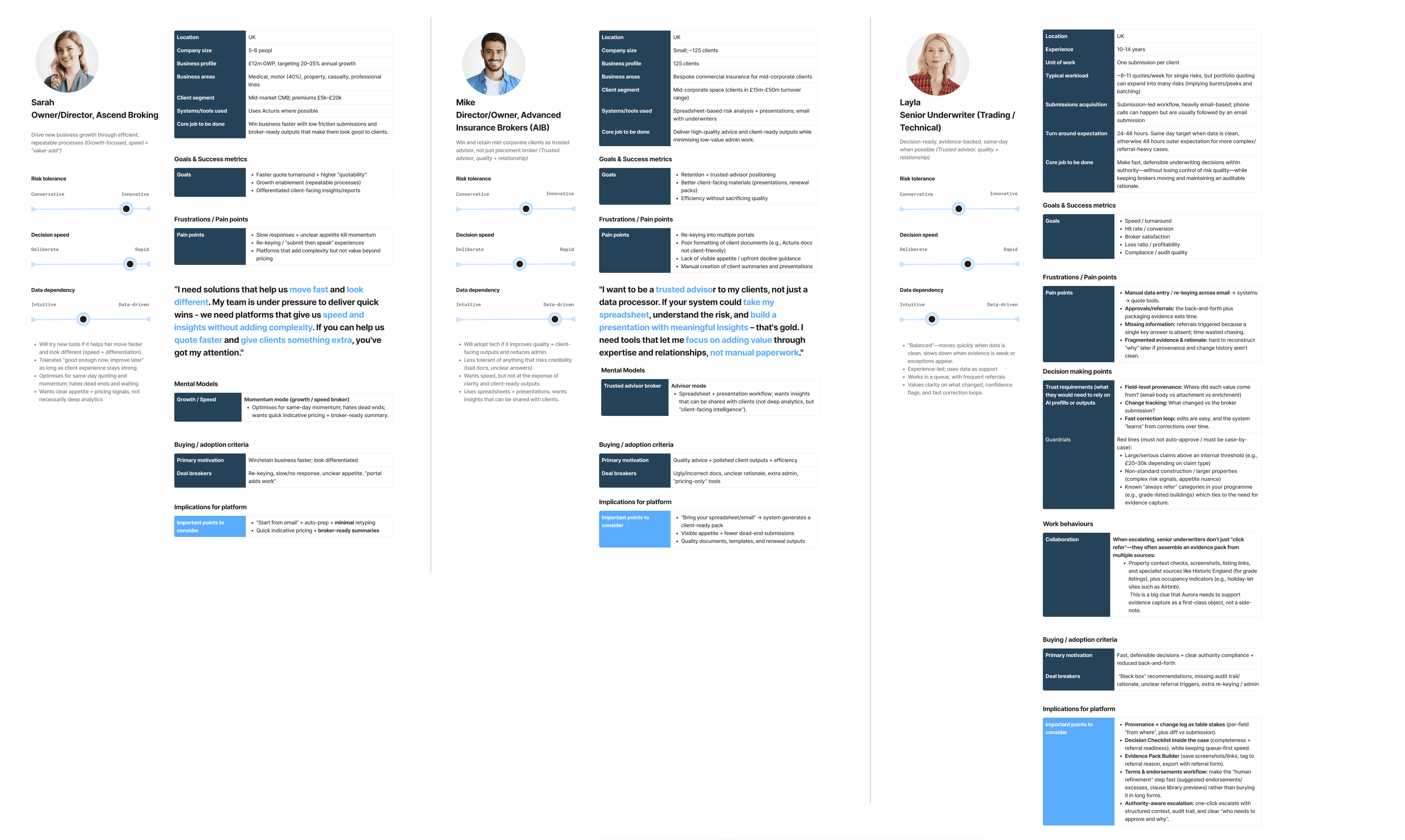 The platform sells to insurers, is used by underwriters and brokers, with downstream benefits to businesses (policyholders). Success looks different for each group, and that fundamentally shapes the experience and product goals.